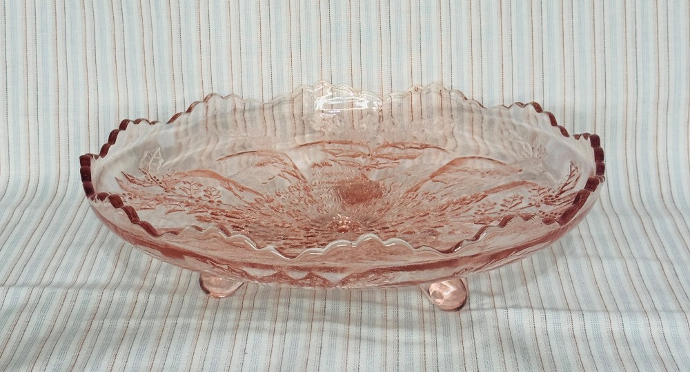 Vtg Fenton Pink Depression Glass footed bowl Stag and Holly